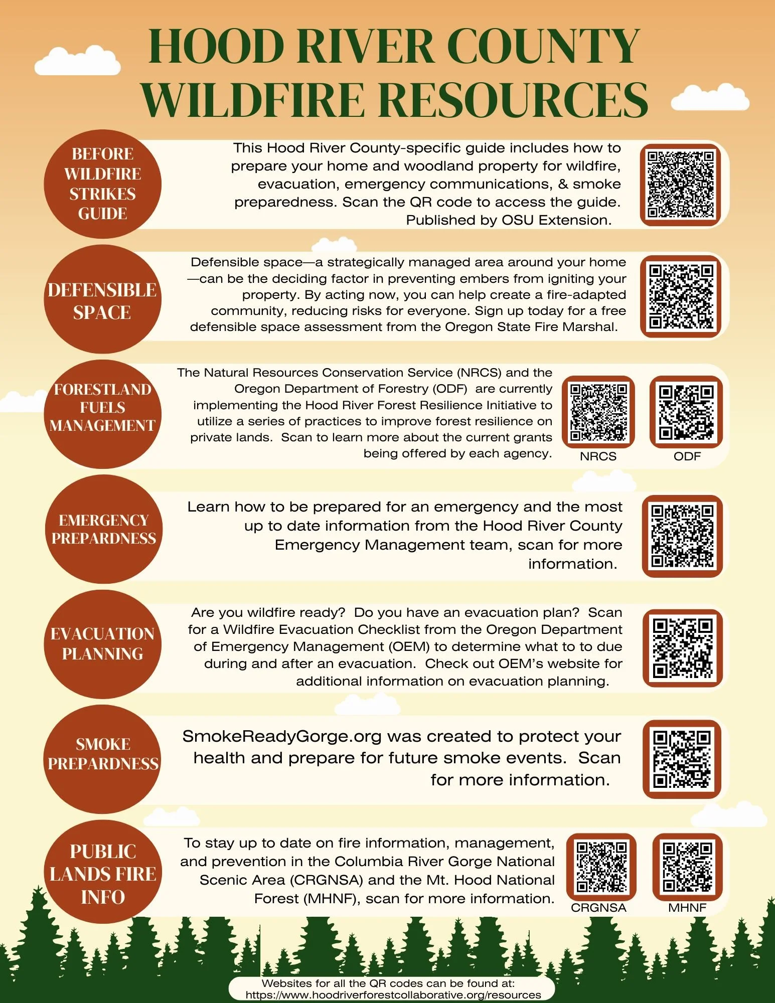 This one-page guide includes an overview of relevant partner organizations and resources to help prepare for wildfire - from defensible space and fuels management to evacuation planning and smoke preparedness. Product was created by Hood River Soil and Water Conservation District and members of the Hood River All-Lands Partnership.